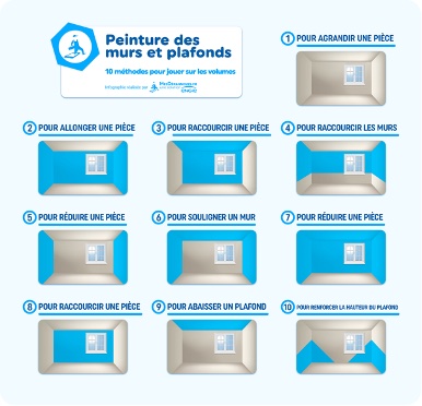 Afin d’élargir l’espace d’une pièce ayant un plafond bas, il est vivement conseillé de le peindre dans une teinte claire. Le choix s’oriente vers le mat qui ne réfléchit pas la lumière et camoufle tous les défauts du plafond. Les murs de la pièce peuvent être recouverts d’une peinture sombre.